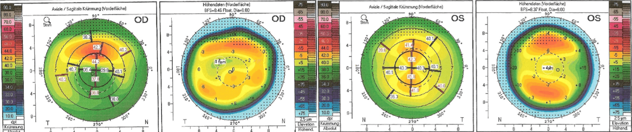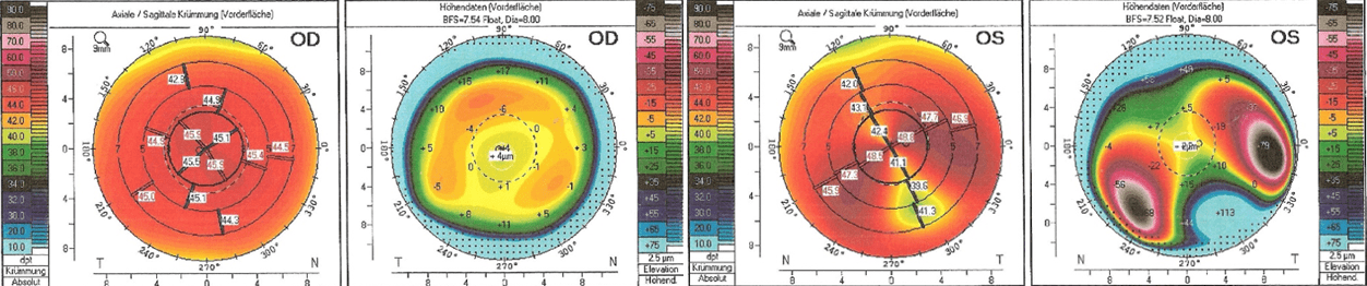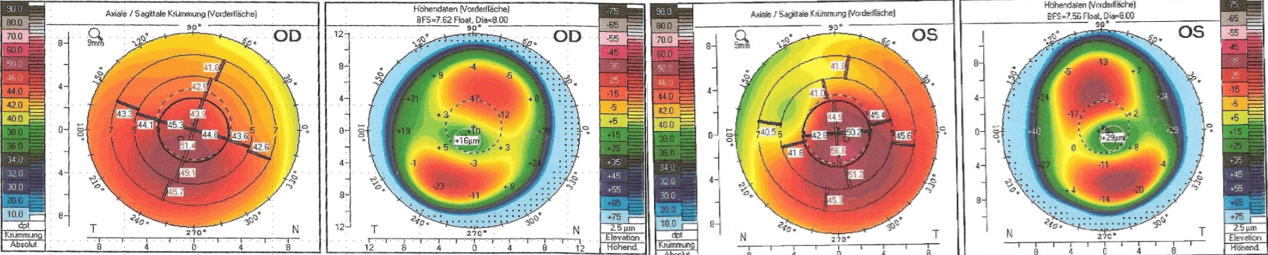 - 28-jähriger Keratokonus-Patient; Arbeitet als Elektriker; Zustand nach Cross-Linking am linken Auge (vor 4 Jahren), Visus stark vermindert; in der Vergangenheit bereits formstabile Kontaktlinsen, welche gut verträglich waren; hofft auf Visussteigerung & Bessere Korrektion als mit Brille